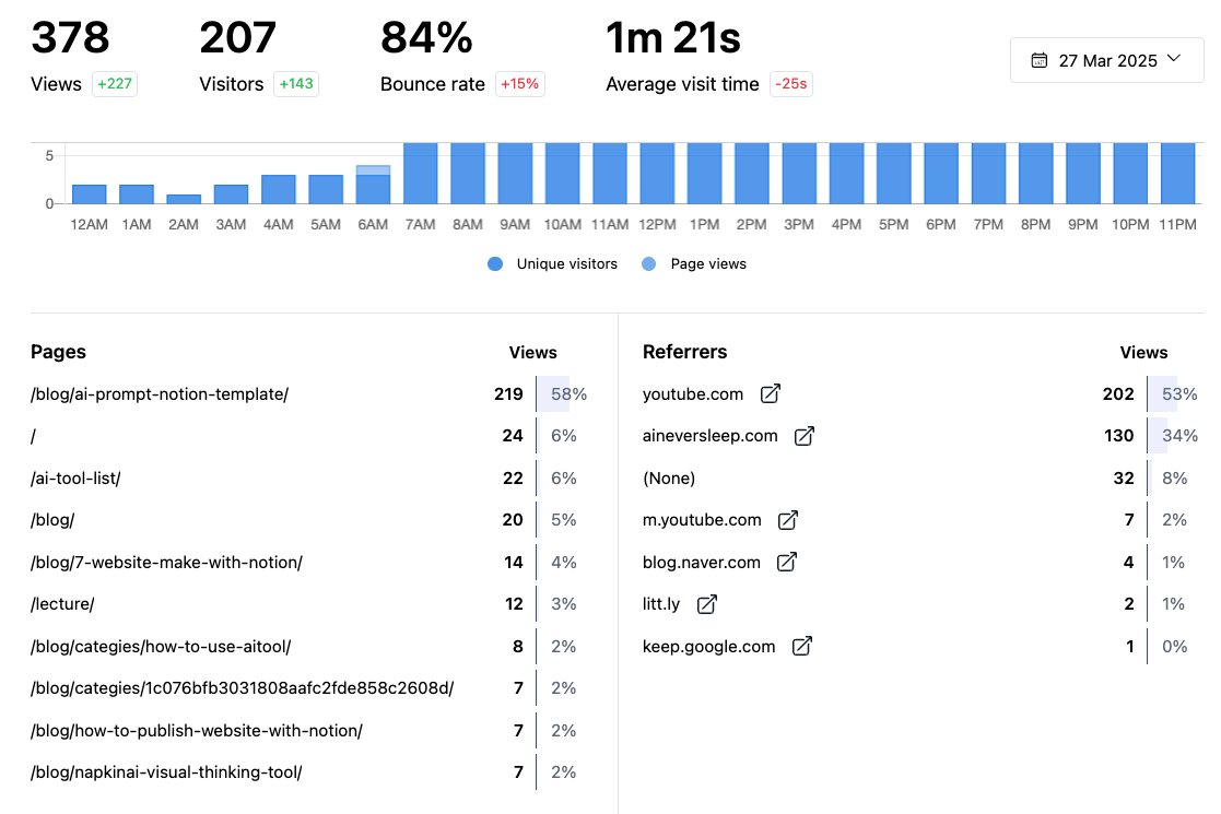 하루 5-6명 방문하던 홈페이지에 유튜브 조회수가 좋을 때 200명이 넘고 체류 시간이 1분 20초를 넘었습니다. 홈페이지 내 콘텐츠 구성을 세밀하게 하고 체류시간을 늘려 보기 위한 개선을 하나씩 해보려 합니다.