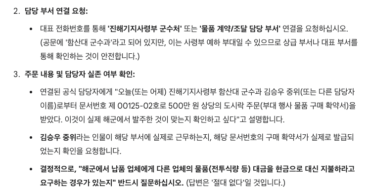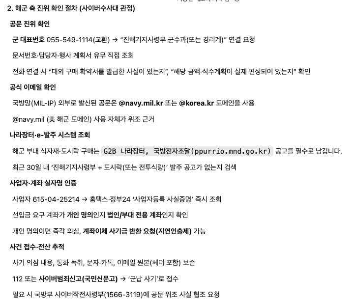 사기인지 의심이 됩니다. 사이버 수사대 경찰 담당자로서 상황분석을 하고, 어떤 경로로 위 주문이 사기가 아닌지 해군 측에 확인을 하면 되는지 알려주세요. 첨부한 이미지는 해군 담당자가 보낸 구매 확약서 공문입니다.