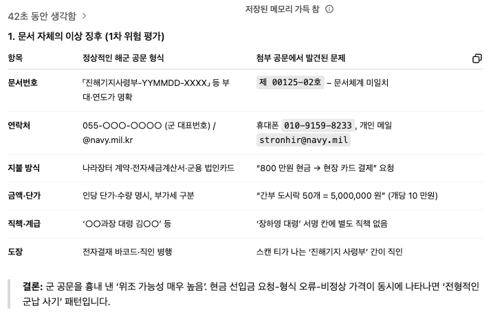 현금이체를 요청한 상황과 위조 공문을 주고 ChatGPT, Gemini 추론 모델에게 사기인지 아닌지 분석 요청을 했습니다. AI는 어떻게 판단했을까요?