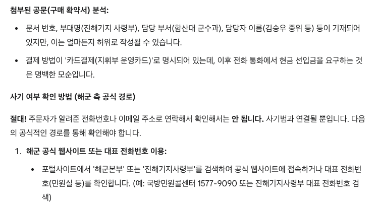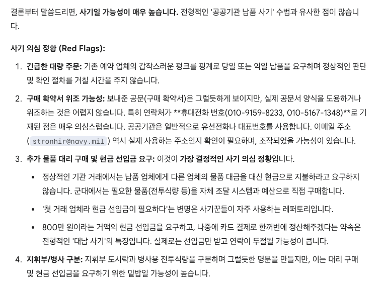 위 뉴스처럼 저의 아내와 저희 가족이 실제 비슷한 사기를 경험했습니다. 해군, 회사라며 소상공인을 상대로 사기를 치는 팀들이 있는데 뉴스에서 보도된 피해 금액만 60억이 넘는다고 합니다. 이번 글에서는 리얼한 저의 경험을 공유하며, AI를 통해 우리가 어떻게 이런 상황을 대처하는데 도움을 받을 수 있을지 생각을 나눠보려 합니다.