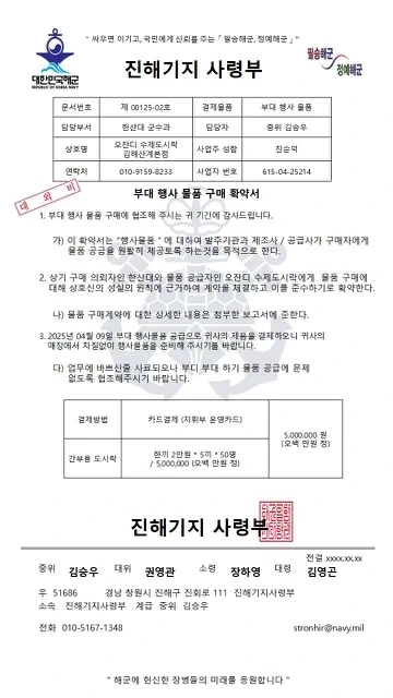 해군에서 훈련을 한다며 500만 원 치 단체 주문이 들어왔어요. 미리 예약해 둔 업체에서 펑크가 났다며 당장 내일 가능하냐며 물어봅니다. 혹시나 싶어서 구매 확약서를 요청하니 담당자가 공식 공문으로 보이는 문서를 보내주었습니다.