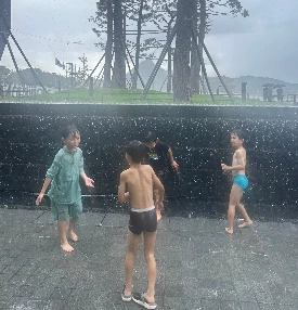 아이들에게 영향을 받아서 한 두명 물놀이 풀장에서 놀던 아이들이 벽면 분수로 왔다.