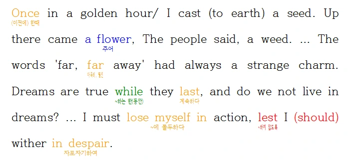 Once in a golden hour I cast to earth a seed. Up there came a flower, The people said, a weed. ... The words 'far, far away' had always a strange charm. Dreams are true while they last, and do we not live in dreams? ... I must lose myself in action, lest I wither in despair.
