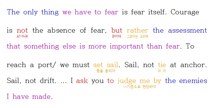 우리가 두려워해야 할 유일한 것은 두려움 그 자체이다. 용기는 두려움이 없는 것이 아니라 두려움보다 더 중요한 무언가가 있다는 판단이다. 항구에 닿기 위해서는 돛을 올려야 한다. 배를 띄워라, 닻을 내리지 말고. 항해하라, 표류하지 말고. ... 내가 만든 적으로 나를 판단해 달라.