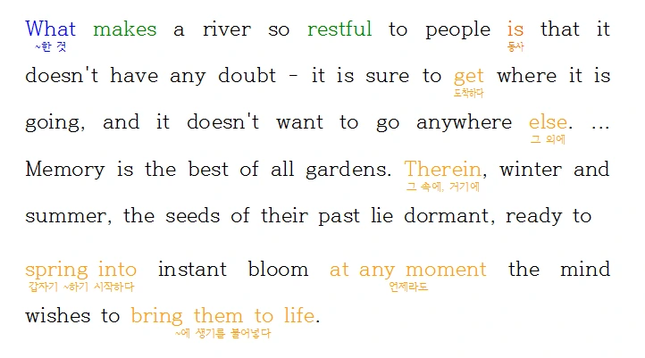 강물이 사람의 마음을 평온하게 하는 이유는 의심이 없기 때문이다. 어디로 가는지 확실히 알고 있으며, 다른 곳으로 가고 싶어 하지 않는다. ... 기억은 모든 정원 중에서도 최고다. 거기에서, 겨울과 여름, 과거를 품은 씨앗들이 잠들어 있다. 소생할 마음이 생기면 언제라도 즉각 꽃을 피울 준비가 된 채로.