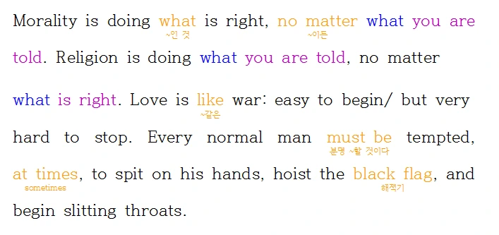 도덕성은 옳은 일을 하는 것이다, 당신이 무엇을 듣든지 간에. 종교는 당신이 들은 것을 행하는 것이다, 그것이 옳든 그르든. 사랑은 전쟁을 닮았다. 시작하기는 쉽지만 중단하기가 매우 어렵다는 점에서. 모든 평범한 사람은 가끔 유혹에 빠진다. 손에 침을 뱉고 해적 기를 매달고, 사람들의 목을 베고 싶다는 생각.
