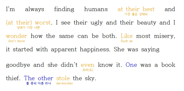 나는 언제나 최선이자 최악의 상태에 처한 인간을 발견한다. 나는 인간의 추함과 아름다움을 보면서 어떻게 그렇게 똑같은 것이 동시에 둘일 수 있는지 의아해한다. 대부분의 불행이 그렇듯 그것도 명백한 행복과 함께 시작되었다. 그녀는 작별을 말하고 있었지만 그녀는 그 사실조차 알지 못했다. 한 사람은 책을 훔쳤고, 또 한 사람은 하늘을 훔쳤다.
