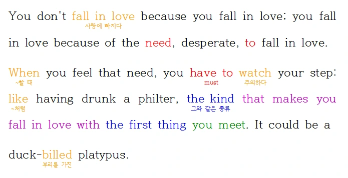 사랑에빠졌기 때문에 사랑에 빠진 것이 아니다. 사랑에 빠지고자 하는 그 절박한 욕구 때문에 사랑에 빠진 것이다. 그 욕구가 느껴질 때에는 발걸음을 조심해야 한다. 흥분제를 마신 것처럼, 그 발걸음은 맨 처음 마주치는 대상과 사랑에 빠져 버리게 만들기 때문이다. 그것은 오리 같은 부리를 가진 오리너구리일 수도 있다.