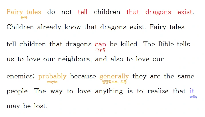 동화는 아이들에게 용이 어딘가에 살고 있다는 이야기를 해주는 게 아니다. 아이들은 이미 용의 존재를 알고 있다. 동화는 아이들에게 용이 죽을 수도 있다는 이야기를 해 주는 것이다. 성경은 우리에게 이웃을 사랑하라고, 또한 원수를 사랑하라고 말한다. 아마 일반적으로 그들이 똑같은 사람들이어서 그런 것 같다. 무언가를 사랑하는 방법은 그것이 사라질지 모른다는 것을 깨닫는 것이다.