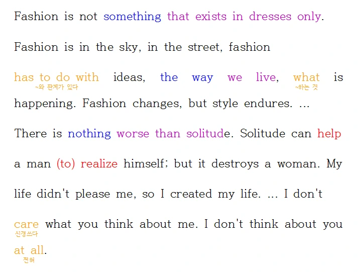 유행은 옷에만 존재하는 것이 아니다. 유행은 하늘에도, 거리에도 있다. 유행은 아이디어와, 우리가 살아가는 방식과 지금 일어나는 일과 관계가 있다. 유행은 변하지만 스타일은 영원하다. ... 고독만큼 나쁜 것도 없다. 고독은 남자의 자아실현을 도와주지만 여자를 파멸로 몰고 간다. 나는 내 삶이 마음에 들지 않아서 내 인생을 창조했다. ... 당신이 날 어떻게 생각하는지 난 관심이 없다. 난 당신 생각을 조금도 하지 않는다.