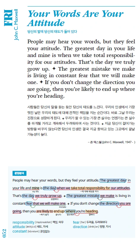 사람들은 당신의 말을 듣는 동안 당신의 태도를 느낀다. 우리의 인생에서 가장 멋진 날은 우리의 태도에 대해 전적인 책임을 지는 순간이다. 바로 그날 우리는 진정으로 성장하게 된다. ... 우리가 할 수 있는 가장 큰 실수는 언젠가는 큰 실수를 하게 될 거라고 계속해서 두려워하며 사는 것이다. ... 지금 당신이 걸어가는 방향을 바꾸지 않는다면 당신의 인생은 결국 지금 향하고 있는 그곳에서 끝날 가능성이 높다.