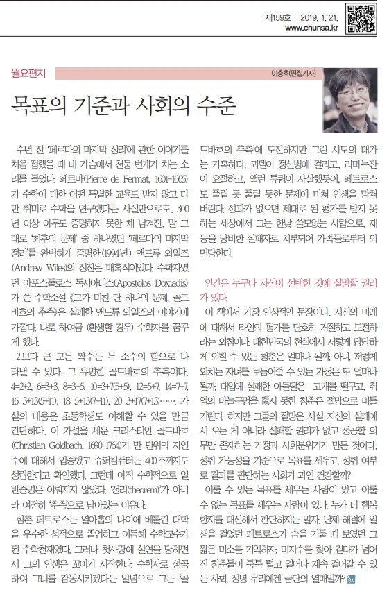 수년 전 ‘페르마의 마지막 정리’에 관한 이야기를 처음 접했을 때 나는 가슴에서 천둥 번개가 치는 소리를 들었다. 페르마(Pierre de Fermat, 1601-1665)가 수학에 대한 어떤 특별한 교육도 받지 않고 다만 취미로 수학을 연구했다는 사실만으로도 그랬다. 300년 이상 아무도 증명하지 못한 채 남겨진, 말 그대로 ‘최후의 문제’ 중 하나였던 ‘페르마의 마지막 정리’를 완벽하게 증명한(1994년) 앤드류 와일즈(Andrew Wiles)의 정진은 매혹적이었다. 수학자였던 아포스톨로스 독시아디스(Apostolos Doxiadis)가 쓴 수학소설 《그가 미친 단 하나의 문제, 골드바흐의 추측》은 실패한 앤드류 와일즈의 이야기에 가깝다. 나로 하여금 (환생할 경우) 수학자를 꿈꾸게 했다.
