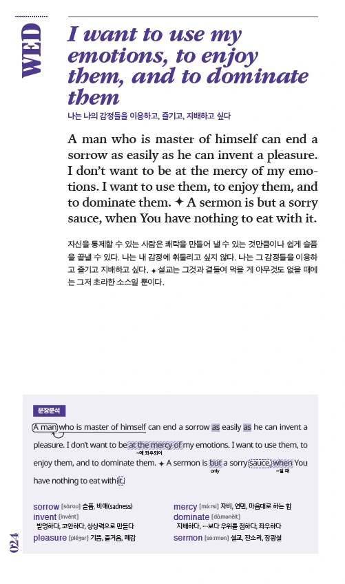 자신을 통제할 수 있는 사람은 쾌락을 만들어 낼 수 있는 것만큼이나 쉽게 슬픔을 끝낼 수 있다. 나는 내 감정에 휘둘리고 싶지 않다. 나는 그 감정들을 이용하고 즐기고 지배하고 싶다. ✦ 설교는 그것과 곁들여 먹을 게 아무것도 없을 때에는 그저 초라한 소스일 뿐이다.
