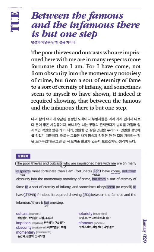 나와 함께 여기에 수감된 불쌍한 도둑이나 부랑자들은 여러 가지 면에서 나보다 운이 좋은 사람들이다. 왜냐하면 나는 무명의 존재였다가 범죄를 저질러 일시적인 악명을 얻은 게 아니라, 영원할 것 같은 명성을 누리다가 영원한 불명예를 얻었기 때문이다. 때로는 그들은 내게 명성과 악명은 단 한 걸음 차이라는 것을 보여주었다는(그런 걸 꼭 보여줄 필요가 있는지 모르겠지만)생각이 든다.