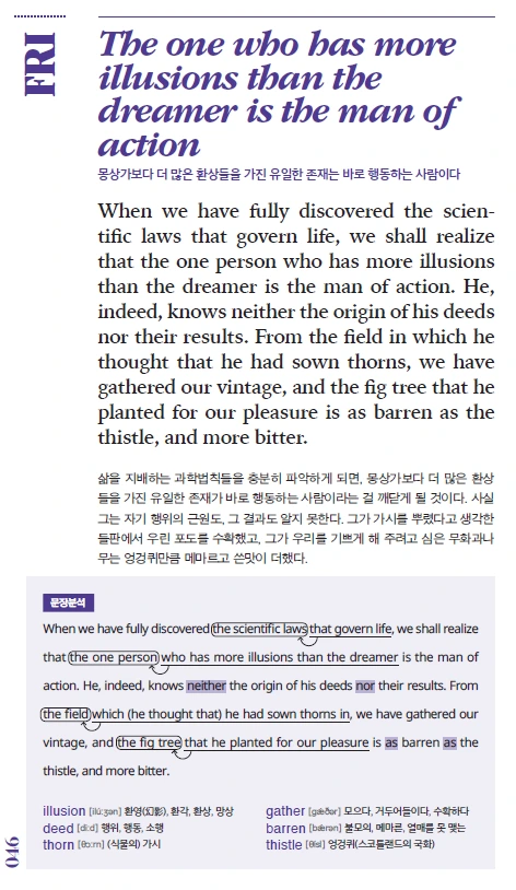 삶을 지배하는 과학법칙들을 충분히 파악하게 되면, 몽상가보다 더 많은 환상들을 가진 유일한 존재가 바로 행동하는 사람이라는 걸 깨닫게 될 것이다. 사실 그는 자기 행위의 근원도, 그 결과도 알지 못한다. 그가 가시를 뿌렸다고 생각한 들판에서 우린 포도를 수확했고, 그가 우리를 기쁘게 해 주려고 심은 무화과나무는 엉겅퀴만큼 메마르고 쓴맛이 더했다.