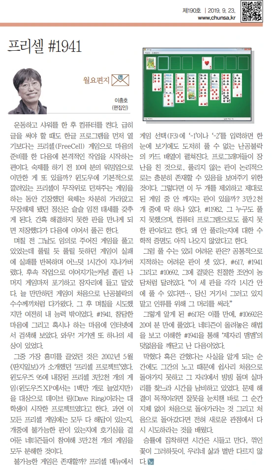 운동하고 샤워를 한 후 컴퓨터를 켠다. 급히 글을 써야 할 때도 한글 프로그램을 먼저 열기보다는 프리셀(FreeCell) 게임으로 마음의 준비를 한 다음에 본격적인 작업을 시작하는 편이다. 숙제를 하기 전 10여 분의 워밍업으로 이만한 게 또 있을까? 윈도우에 기본적으로 깔려있는 프리셀이 무작위로 던져주는 게임을 하는 동안 긴장했던 육체는 차분히 가라앉고 무장해제되었던 정신은 슬슬 임전 태세를 갖추게 된다. 간혹 해결하지 못한 판을 만나게 되면 저장했다가 다음에 이어서 풀곤 한다.