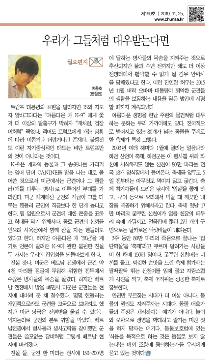 트럼프 대통령의 표현을 빌리자면 IS의 지도자 알바그다디는 “아름다운 개 K-9” 에게 쫓겨 더 이상의 탈출구가 막히자 “개처럼, 겁장이처럼” 죽었다. 적어도 트럼프에게 개는 상황에 따라 이롭거나 더럽거나인 존재다. 불행히도 이런 자기중심적인 태도는 비단 트럼프만의 것이 아니라는 것이다.
