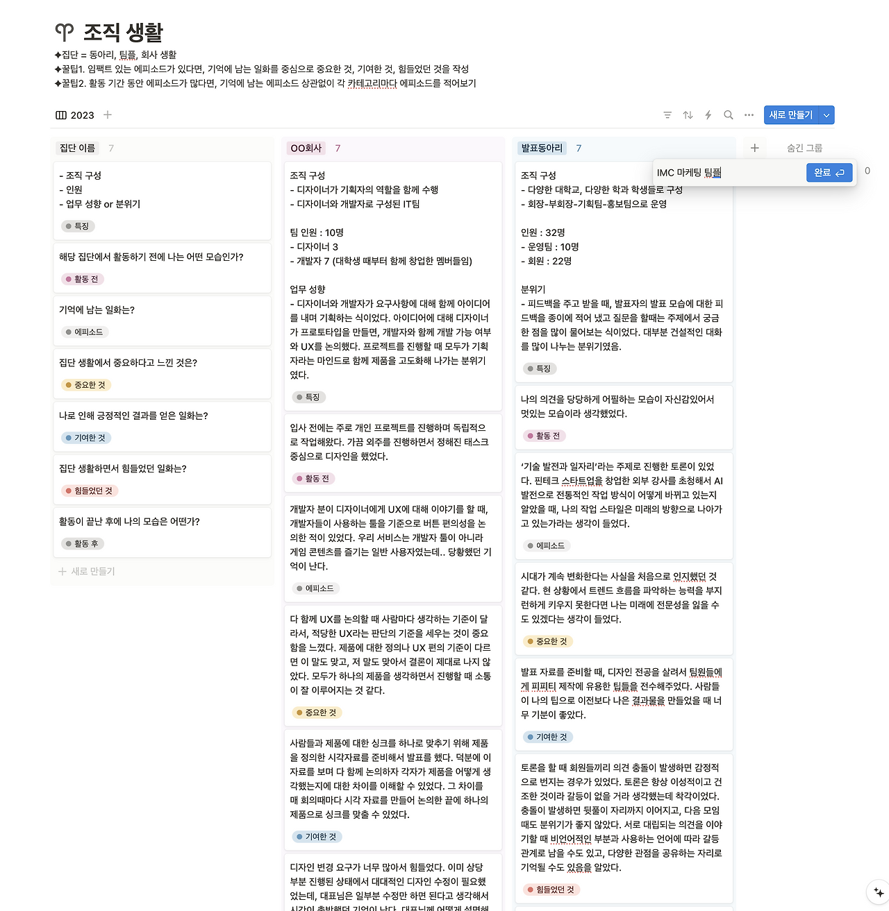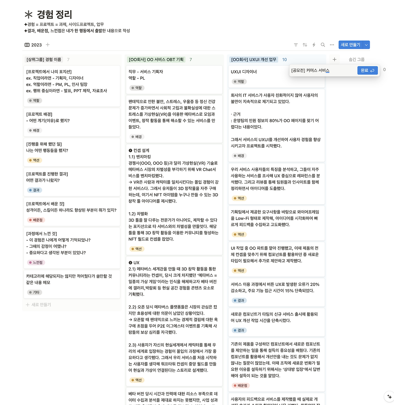 회사 생활이 아니어도 특정 집단을 대입해서 작성해 보아도 도움이 된다. 예를 들어 연합동아리 활동이나 팀플 경험도 괜찮다. 나는 집단으로 활동한 경험은 모두 대입해서 정리했다.