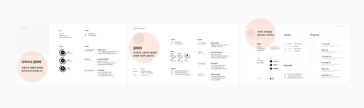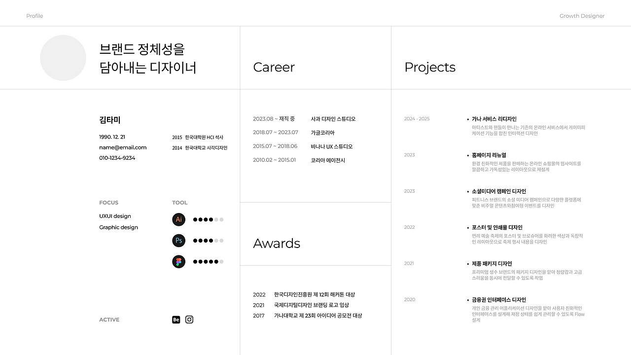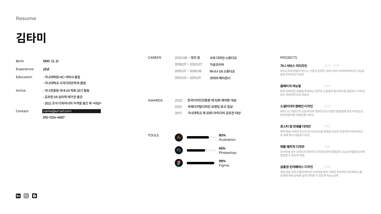 이력서에 기재하는 내용들을 동일하게 적었다. 이력서와 차이가 있다면, 채용 시스템에 등록하는 이력은 통일된 양식으로 보인다. 하지만 포트폴리오의 이력은 어떻게 레이아웃을 구성하느냐에 따라 상대방에게 인지되는 이력 포인트를 직접 유도할 수 있다. (이런 부분이 UX 측면이다.)