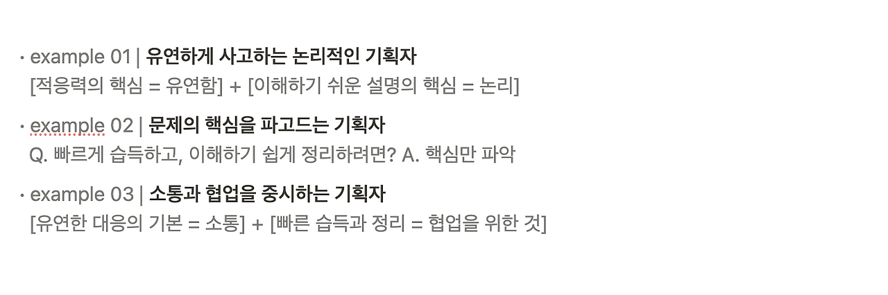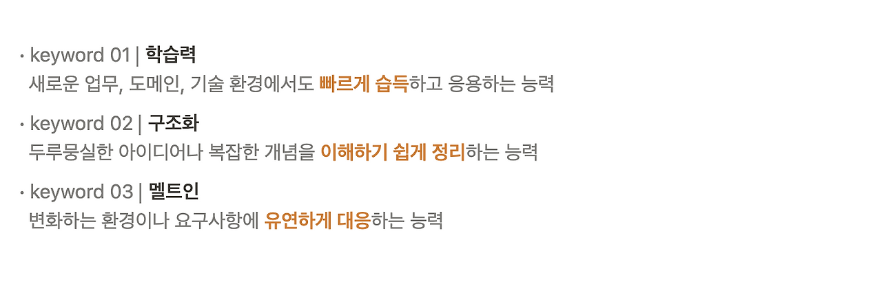 여기서 팁은, 노션으로 정리한 경험들을 보면서 문장을 만드는 것이다. 키워드의 출처가 자신의 경험이기 때문이다. 내가 실제로 작업한 예시처럼 스스로 질문을 던져봐도 좋고, 같은 의미이지만 다른 표현으로 정리해 보아도 좋다. 한 문장으로 표현하는 것의 핵심은, 경험으로 쌓은 역량을 담아내는 것이니까.