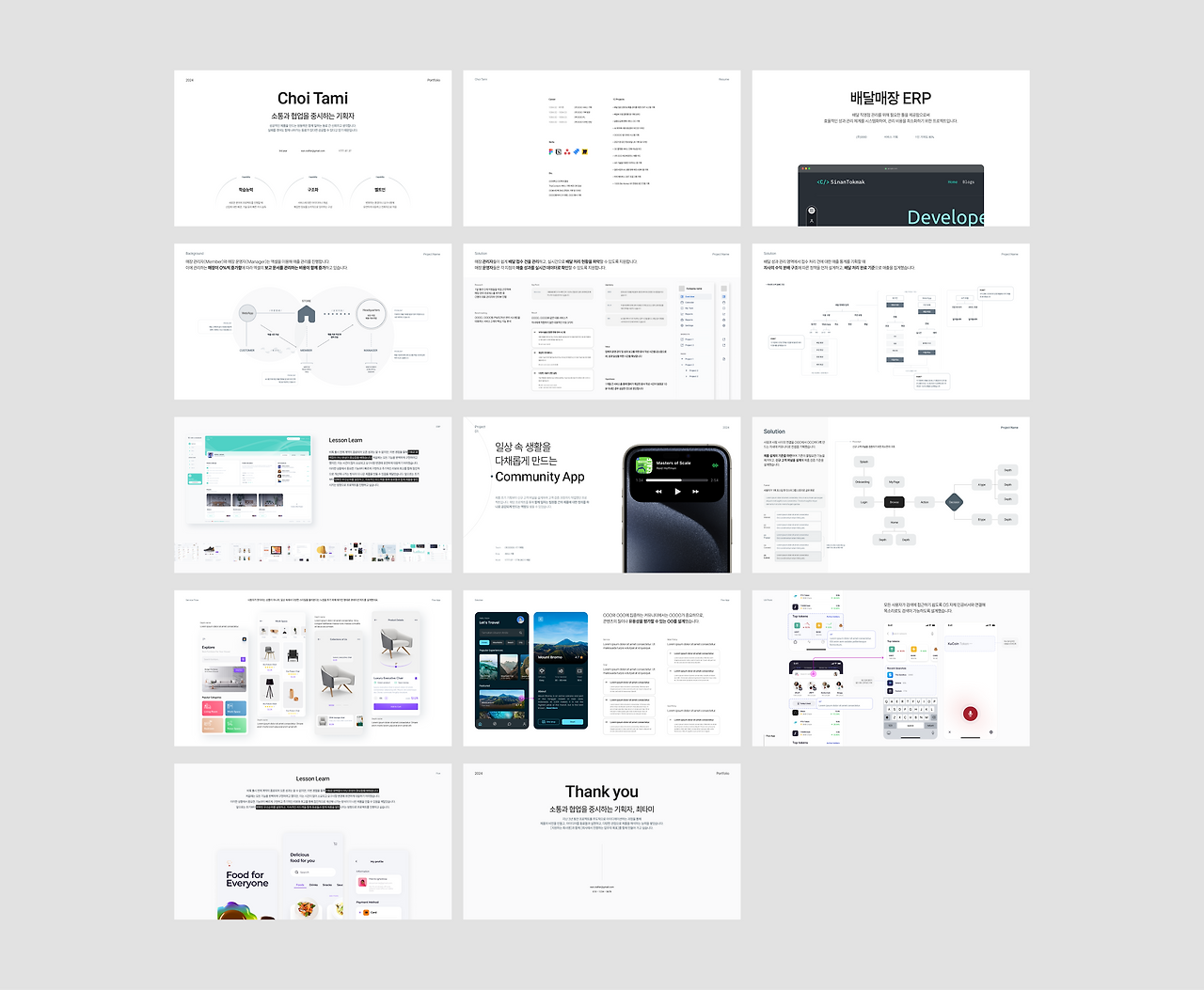 핀터레스트나 노트폴리오에서 보이는 디자이너들의 포트폴리오는 너무 비주얼 중심이라 나와 맞지 않았다. 나는 스토리를 보여 주고 싶었기 때문이다. 파워포인트로 판매하는 피피티 포트폴리오는 표현력이 제한적이었다. 템플릿에서 제공되는 컬러나 구성에서 벗어나면, 어딘가 조잡스러운... 그런 느낌이랄까. 무엇보다 대학생 과제 느낌의 템플릿이 많아서 별로였다.