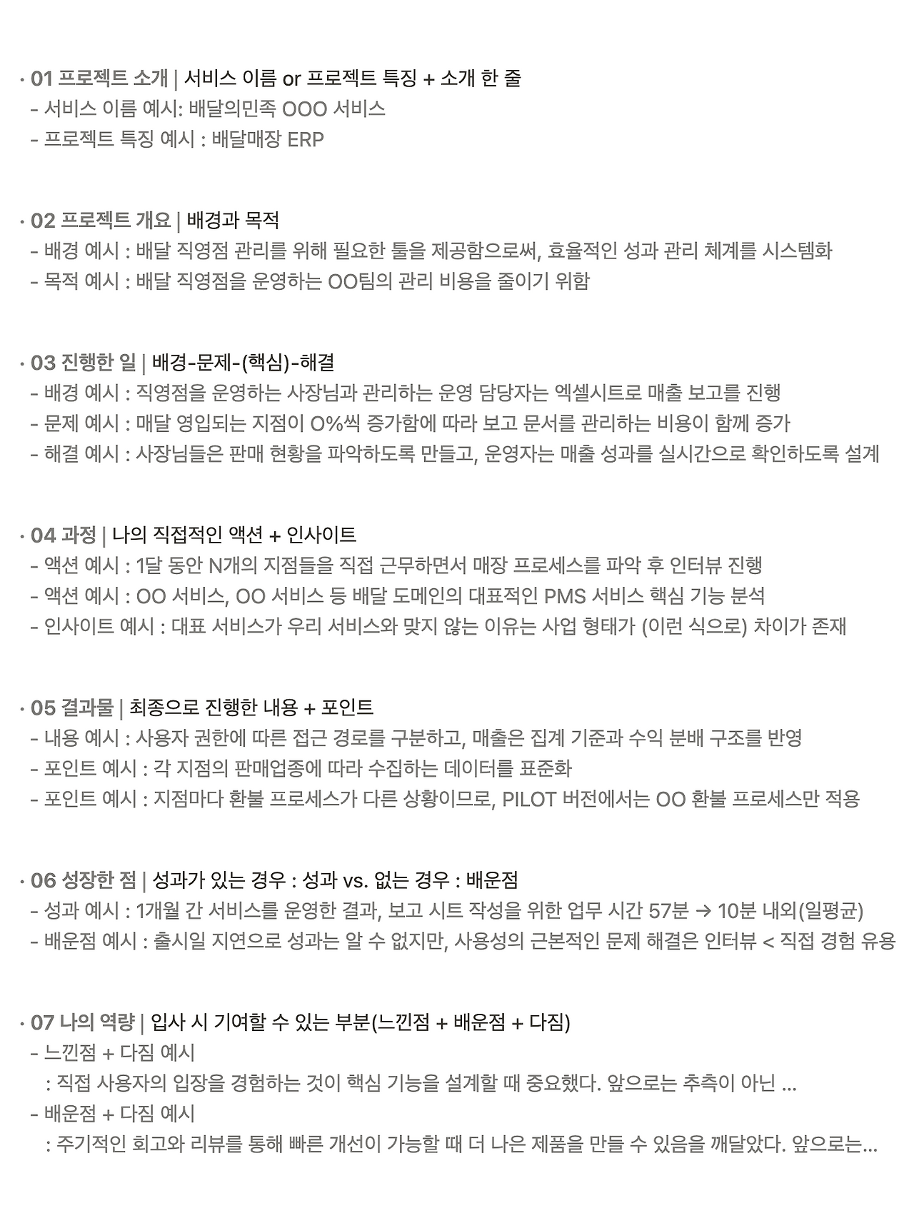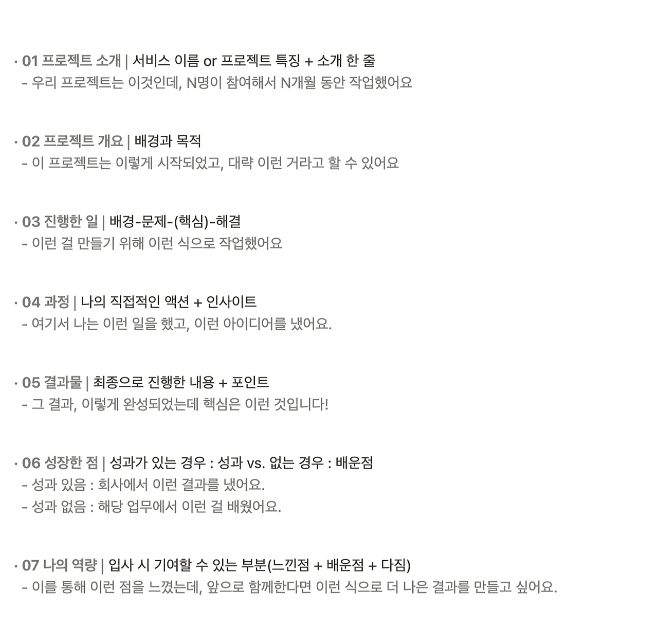 합격만 바라며 만들었던 포트폴리오 편에서 공유한 구성을 상세하게 설명하면 위 내용과 같다. 이 구성을 기본 포맷으로 사용하면, 스토리라인을 논리적으로 전개할 수 있었다.