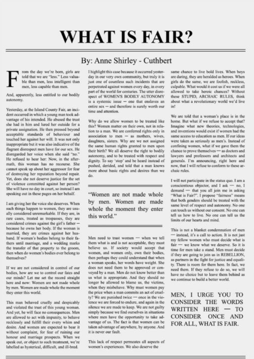 그녀는 남자아이가 아니어서 실망하는 마릴라 남매에게 `여자아이는 왜 일을 못 한다고 생각하시나요`라고 말하며 주장을 펼치기도 한다. 그녀는 당대에는 낯설었던 페미니스트적 시각을 가지고 동성애자, 흑인, 캐나다 원주민들을 보듬어 나가는 마음을 품었다. 어쩌면 <Anne with an E>의 ‘E’는 ‘Equality'(평등)를 뜻하는 것이 아닐까 싶기도 하다.
