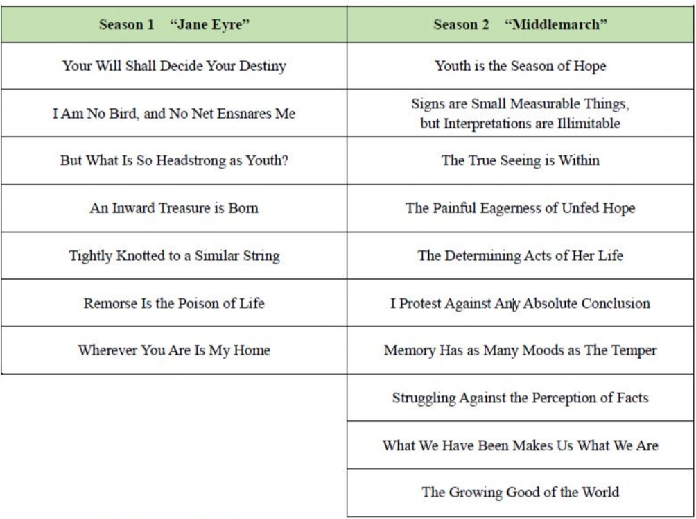 시즌 1 에피소드의 제목들은 ‘제인 에어’의 인용구로 쓰였을 정도니 말 다 한 셈. 더불어 시즌 2 에피소드 제목들은 작은 마을에서 벌어지는 여성들의 삶에 관한 메리 앤 에번스의 소설 <미들 마치>의 인용구로 구성되었다.