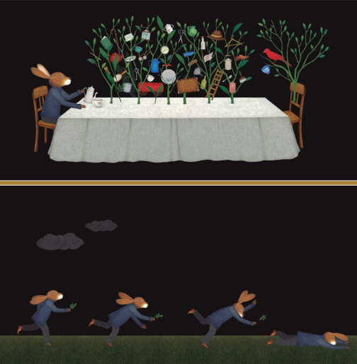 그림책의 첫 장면에는 찻잔을 들고 식탁으로 가는 토끼가 보입니다. 식탁에는 나무가 자라고 나뭇가지에는 살림살이가 걸려 있습니다. 맞은편에 새가 앉아 있는데, 갑자기 새가 식탁보를 움켜쥐고 날아가네요. 식탁 위에 모든 것이 부서지고 당황한 토끼는 허겁지겁 새를 쫓아갑니다. 예상하지 못한 사건으로 금이 간 토끼의 일상은 회복할 수 있을까요?