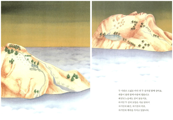 <두 사람>은 시적인 이미지로 꽃과 꽃받침과 같은 관계, 서로만의 화산과 분화구를 갖고 있지만 같은 노을에 물드는 섬과 같은 관계, 따뜻한 노랑과 차가운 파랑이 만나 초록을 만드는 관계 등 다양한 관계를 보여줍니다. 두 사람은 같은 세계에 있어도 서로 다른 장면을 바라보지만, 이 둘은 새 생명을 만들 수도 있는, 함께하는 관계가 될 수도 있는데요.