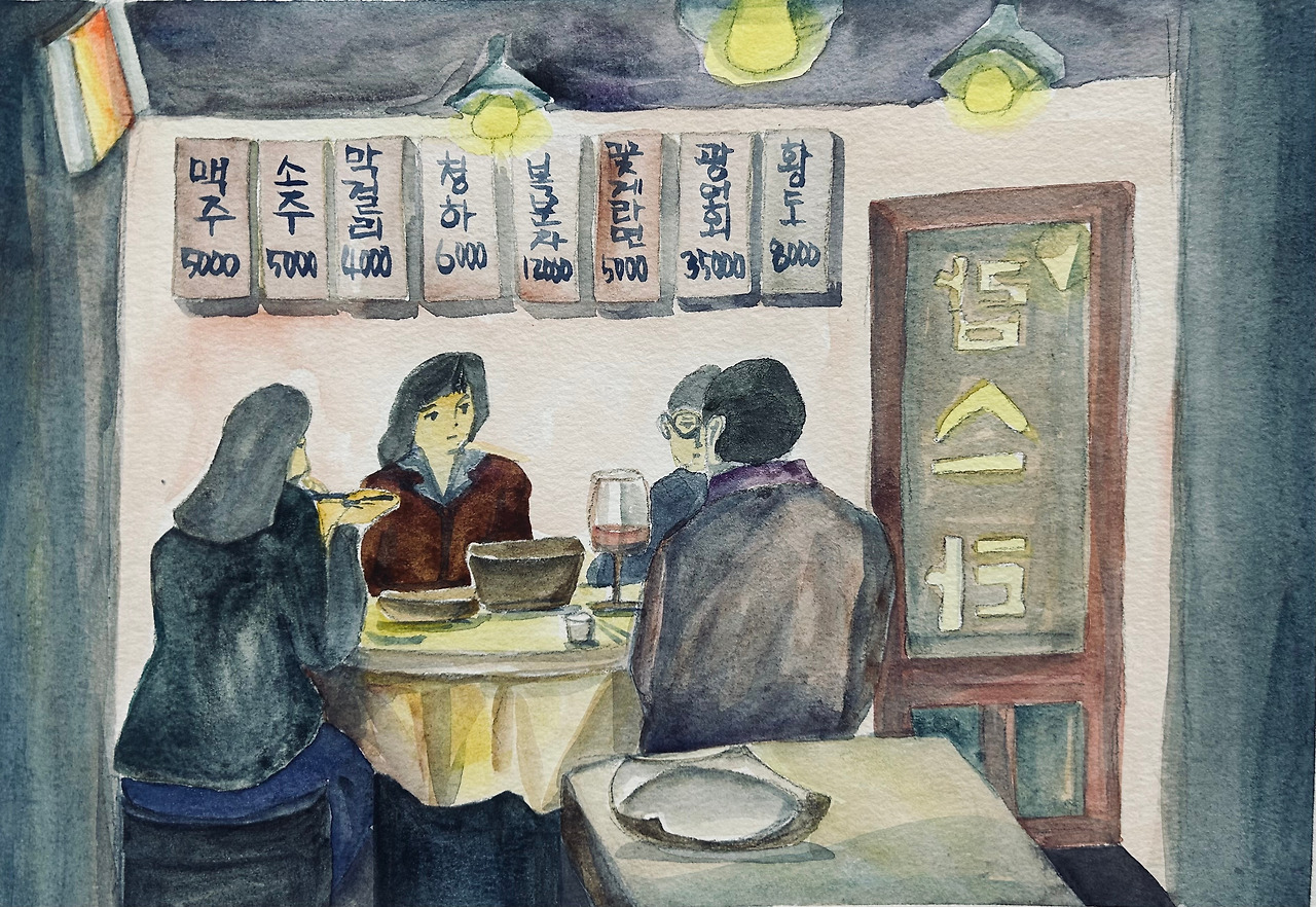 좁은 골목에 자리한 식당은 몇십 년 전의 모습 그대로인 것 같았고 식당 안은 테이블 세 개가 허름하게 있었다. 우리가 앉은 옆 테이블의 손님 중 한 명은 큰애와 아는 사람이었다. 우연한 만남에 큰애와 지인은 반갑게 안부를 주고받았고 나도 얼떨결에 인사를 나누었다.