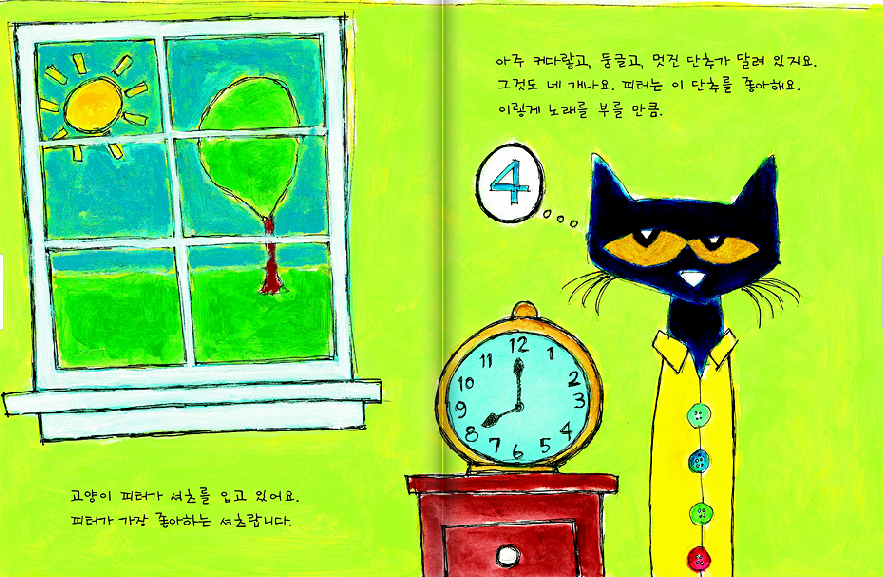 <고양이 피터 멋진 내 단추 네 개>의 피터는 자신이 좋아하는 것을 잃으면서도 무한 긍정의 모습을 보여줍니다. 자신이 좋아하는 셔츠의 단추가 하나, 둘 떨어져도 절망하거나 울지 않고 “단추는 떨어질 수도 다시 달 수도 있다”라고 생각하죠. “단추 하나 없으면 어때?”라며 “멋진 내 단추” 노래를 부르죠.