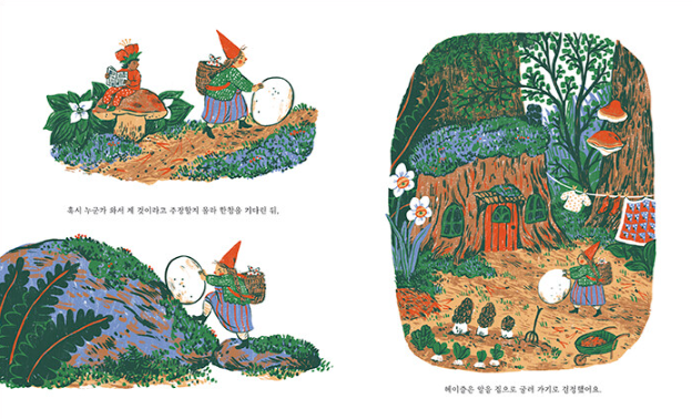 민담은 초현실적인 등장인물과 사건이 나오는 경우가 많아 판타지 그림책으로 많이 재화 되었는데요. 민담과 다른 점이라면 구전된 이야기를 재화 하는 데 그치는 것이 아니라 작가의 상상력을 발휘하여 무생물이나 동‧식물이 사람처럼 말하고 행동하는 것처럼 그린 것입니다.