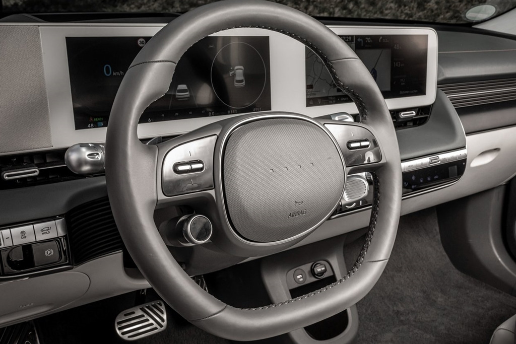 해당 버튼은 아이오닉5에서도 적용되었던 드라이브 모드 변경 버튼으로 추정된다. 우측에도 또 하나의 버튼이 존재하지만, 아직 정체는 불명확하다. 스테어링 휠의 우측 버튼에는 음성인식, 즐겨찾기, 통화, 볼륨 조절 컨트롤러 등등의 기능들이 적용됐다.