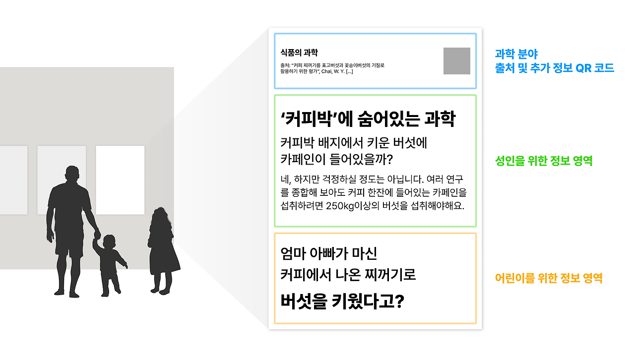 이러한 고민 끝에 커피박이 단순히 다른 소재로 대체되는 것에 그치지 않고, 자원 순환의 다양한 가능성을 탐색하고 소개하기 위해 커피박으로 키운 버섯을 기념품으로 판매하는 아이디어를 시도했다. 일정 비율의 커피박을 톱밥과 함께 배합하면 버섯을 키울 수 있는 배지로 활용이 가능하며⁽²⁾, 해당 아이디어 실현을 위해 협력 업체인 커피큐브의 도움을 받아 커피박 배지 버섯 실물을 상점에 비치했다. 식품 판매 규정으로 인해 실제 버섯을 판매할 수는 없었지만, '커피박으로 키운 버섯에는 카페인이 있을까?'와 같은 흥미로운 과학 정보를 포스터로 제공하여 방문객들의 상상력을 자극하고 과학 지식을 전달했다.