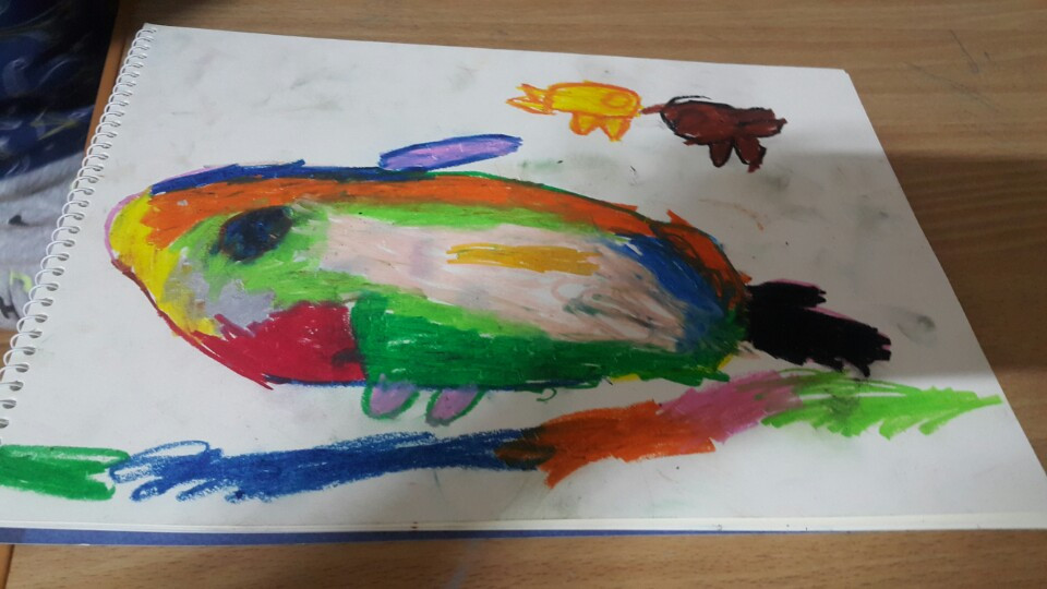 림돌이 되게 할 수는 없었다. 47개월 아이에게 만 두 살짜리용 쉬운 교재를 두 권 선물해 놀이인 듯 시도해봤다. 다행히 흥미를 느낀 아이는 혼자서 매일 선긋기를 연습하고, 숫자를 써보고, 금세 그림을 그릴 수 있게 되었다. 쓰기와 그리기에 관심이 샘솟을 무렵 형 누나들에게서 자극도 받은 아이는 2주 간 훌쩍 커버렸다. 그 성장을 혼자 겪었을 아이 생각에 한 번 짠하고, 직접 그려 보내준 그림에 두 번 짠하다.