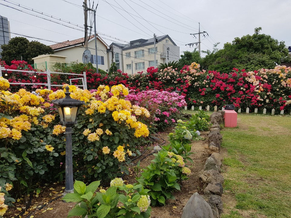 두 번째 사진기억은 제주 한 카페였다. 남편이 있는 제주에서 수많은 곳을 가보고 각양각색의 꽃을 즐겼지만 기억에 남을 만큼 예뻤던 장소는 장미정원이 있는 이 곳이었다. 장미 하면 아파트 담장 어디에나 피어있는 흔하디 흔한 꽃이라고만 알고 있었는데 이렇게 본격적으로 판을 벌여 보여주니 그 다양한 색상과 화려한 어우러짐에 놀라지 않을 수 없었다. 늘 회사일로 바쁘고 제주를 찾는 다른 지인들에게 시간을 내어주느라 나와 함께할 시간은 부족했던 남편에 대한 원망이 커질 무렵, 남편은 오랜만에 시간을 내어 나를 그리로 데려갔다. 둘만 여유롭게 즐긴 데이트라 그 의미가 남다르기도 했지만 한때 휴대폰의 배경 사진으로 해 놓을 만큼 그냥 작정하고 예쁜 곳이어서 가끔씩 생각나는 곳이다.