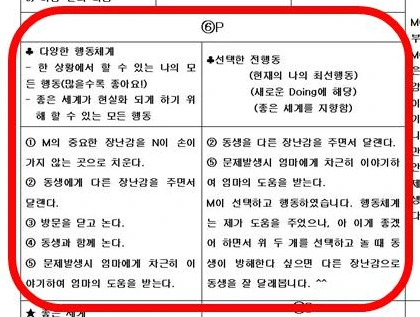 6번 왼쪽을 보면 다양한 행동체계에 5가지의 방법이 기록되어 있습니다. 이것은 초3형과 엄마가 함께 논의하여 어떻게 하면 동생이 형이 노는데 방해하지 않고 놀 수 있는지 전략을 짜는 것입니다. 엄마와 아들이 일종의 바람을 이루기 위해 브레인스토밍을 하는 과정입니다.