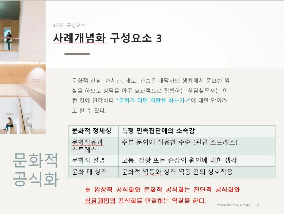 세 번째 고려할 사례개념화의 요소는 문화적 공식화이다. 대체로 내담자의 문화적 배경 요소를 고려하는 것인데 다인종 국가인 미국에서는 이 부분의 위치가 중요한 편이나 우리나라의 경우는 임상적 공식화의 서브적 역할만 한다고 생각해도 된다. 다만, 최근 다문화 가정이 늘어나고 우리나라 안에서의 외국인의 거주 비율이 점점 늘어나고 있는 현실은 문화적 공식화의 고려를 비중이 늘어나야 함을 말한다.