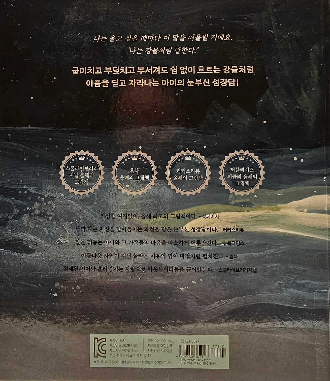이 책에서 주인공이 강물처럼 말할 때 딱 그런 감정을 느꼈기 때문이다. ‘나는 강물처럼 말해요’는 말을 더듬는 아이가 강물과 마주하며 내면의 아픔을 치유하는 이야기를 담고 있다. 사실 처음에는 시선을 사로잡는 아름다운 그림책 표지 때문에 손이 갔다. 다음은 오른쪽 상단에 있는 뉴욕타임스 올해의 그림책 배지에 눈이 갔다. 뭔가 있어 보이는 뉴욕타임스 올해의 그림책은 미국에서 출간된 그림책 중 뉴욕타임스 북 리뷰가 선정하는 10권을 말한다.