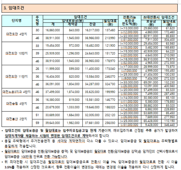 대전봉산 2단지의 59형 기준으로 봤을 때 보증금 39,643,000원/월임대료 256,030원이다. 전환가능 보증금 최대한도는 25,000,000원까지 가능하며 보증금 65,428,000원/월임대료 110,190원으로 보면 된다.