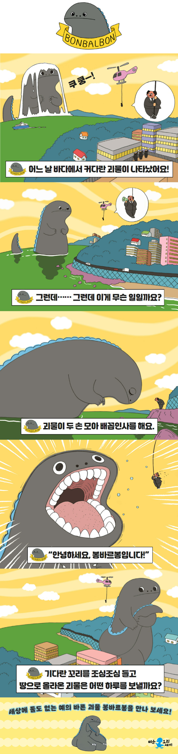 봉바르봉이라는 괴물은 강렬한 달콤함이라기보다는 순한 맛이다. 괴물이라기보다는 조구만 스튜디오의 공룡처럼 귀여운 느낌이다. 심지어 예의까지 바르다. 봉바르봉를 읽지 않고서도 치명적인 귀여움과 예의에 빠져들도록 해보겠다. 그리고 이 글을 다 읽을 때쯤 읽고 싶어 진다면 밀리의 서재에서 '봉바르봉'을 검색해 보시라! 현재 밀리의 랭킹 어린이/청소년 부문에 3위를 하고 있을 만큼 인기 있기도 한 그림책이다.