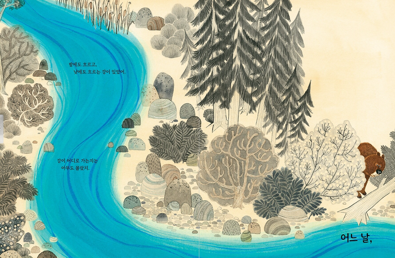 그림책의 좋은 점은 아이들에게 주는 단편적인 교훈뿐만 아니라 일상 생활 곳곳에 녹아있는 나의 결핍, 아픔, 부족함, 혹은 반대의 감정들. 충만함, 편안함, 평온함 등의 감정까지도 다시 생각하게 해준다는 것이다. "곰이 강을 따라갔을 때"를 읽자마자 정말 오랜만에 '이거다!' 하는 생각이 들었다. 무채색, 흑백으로 보이는 배경색에서 새파랗고 쨍한 채도를 가진 강물이 흘러내린다. 보기만 해도 시원해 보이는 강물이다. 이 강물이 어디로 흘러가는지는 아무도 모른다. 곰은 '그저 궁금해서'라는 이유 하나만을 강을 따라가다 첨벙 빠져버린다.