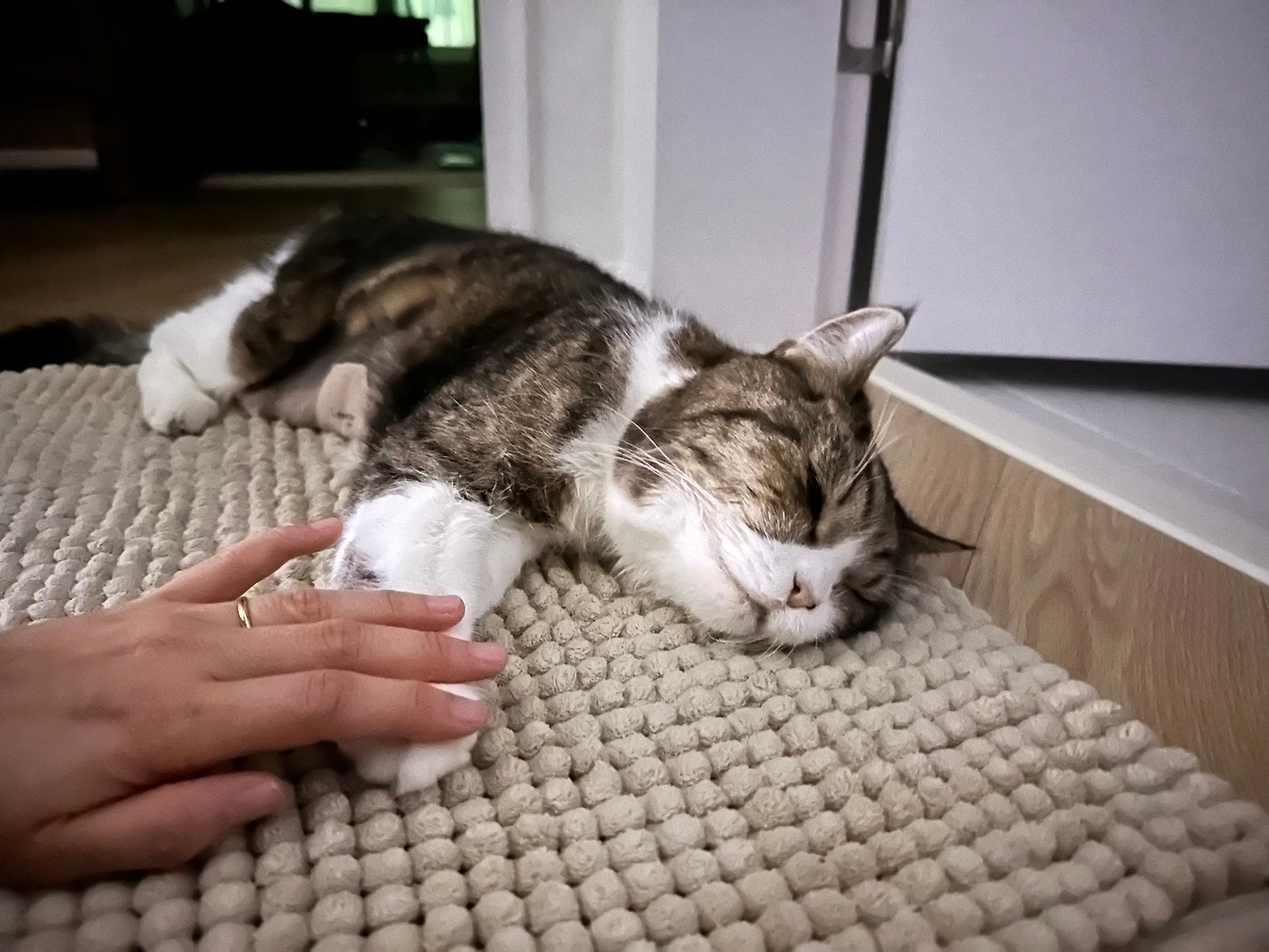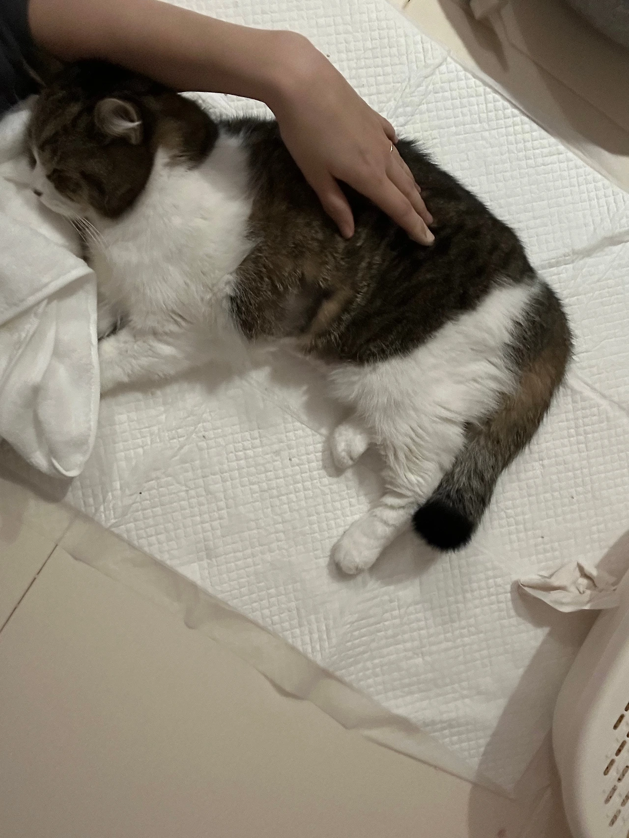 며칠 뒤 정배는 아무것도 먹지 않고 바닥에 붙어 누워만 있기 시작했다. 굶어 죽게 수는 없는 노릇이니 병원에서 수액을 맞히고 마약성 진통제 패치를 붙이고 집으로 오는 매일이 반복됐다. 말을 할 수 없는 고양이가 배가 고파서 괴로운지 억지로 먹는 것이 괴로운지 아파서 괴로운지 아니면 그 모두인지 알 수가 없어 우리도 괴로웠다. 처음 진료를 받은 동네 동물병원과 정배 CT를 찍은 큰 동물병원에서 모두 조심스레 안락사를 제안하셨을 정도로 정배의 건강은 악화되어 갔다.