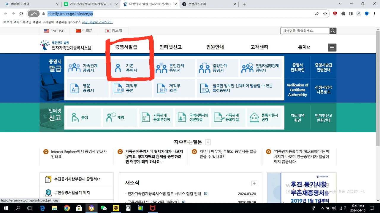 2. 고인기준의 기본증명서 발급