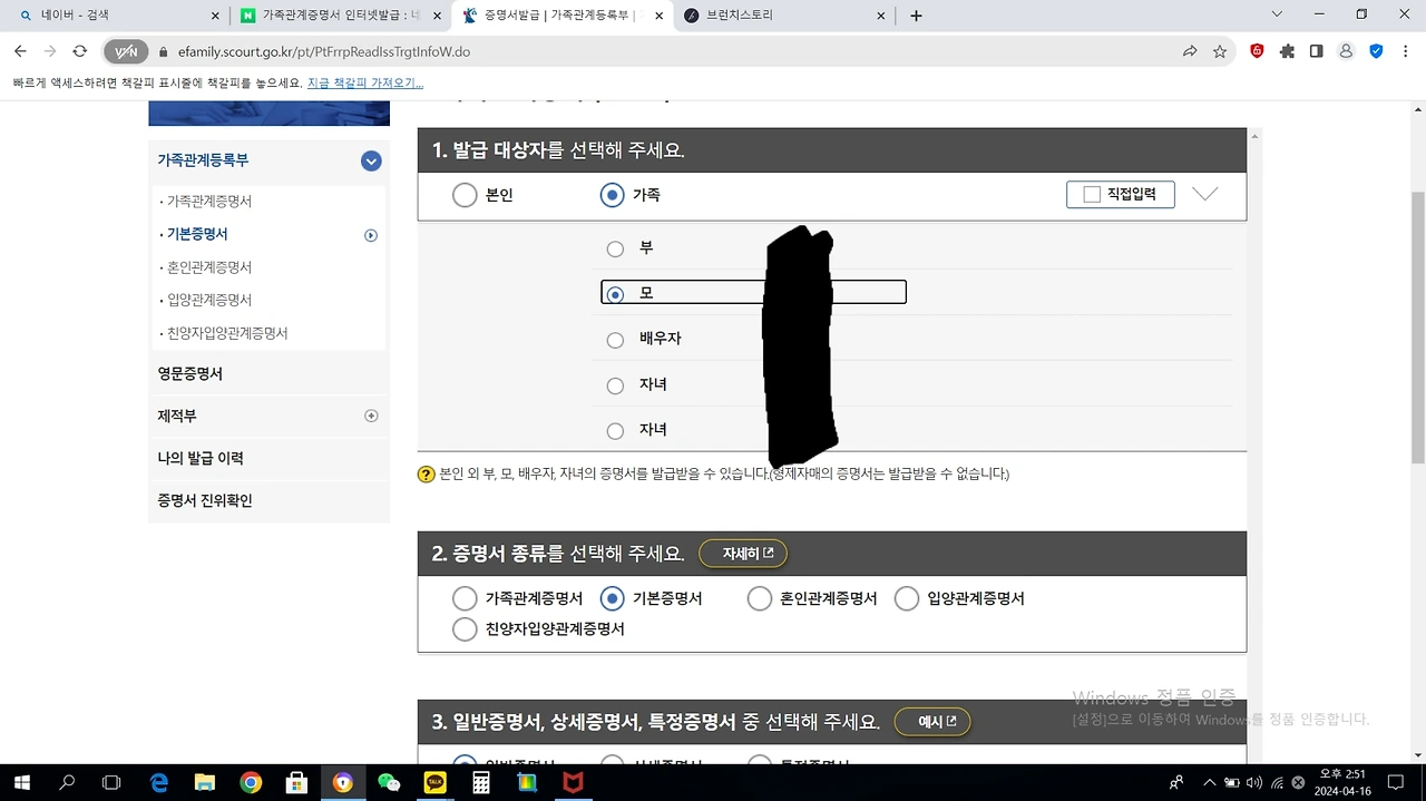 본인이 아니어도 가족의 증명서를 받는 방법은 이러하다.