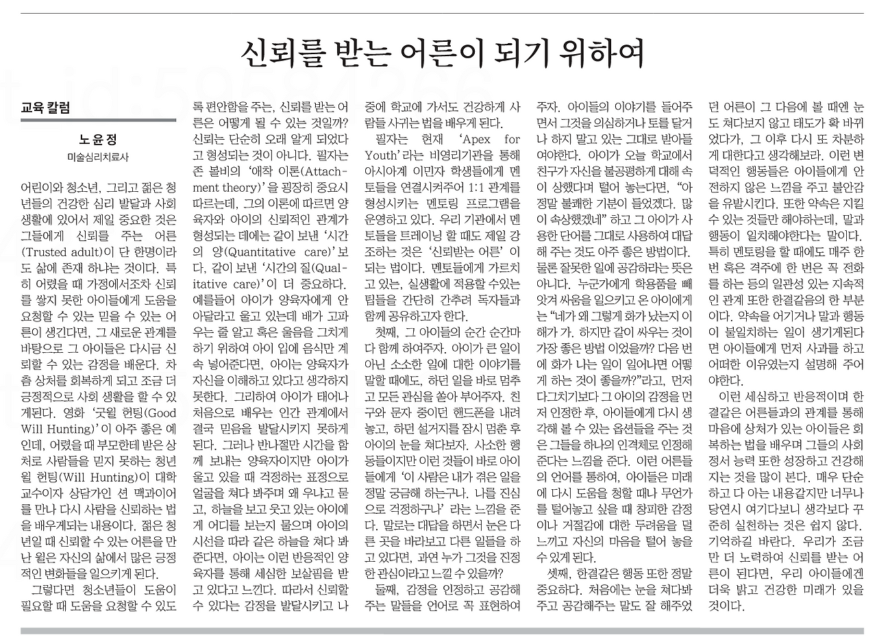필자는 현재 Apex for Youth라는 비영리기관을 통해 아시아계 이민자 학생들에게 멘토들을 연결시켜주어 1:1 관계를 형성시키는 멘토링 프로그램을 운영하고 있다. 우리 기관에서 멘토들을 트레이닝할 때도 제일 강조하는 것은 ‘신뢰받는 어른’ 이 되는 법이다. 멘토들에게 가르치고 있는, 실생활에 적용할 수 있는 팁들을 간단히 간추려 독자들과 함께 공유하고자 한다.