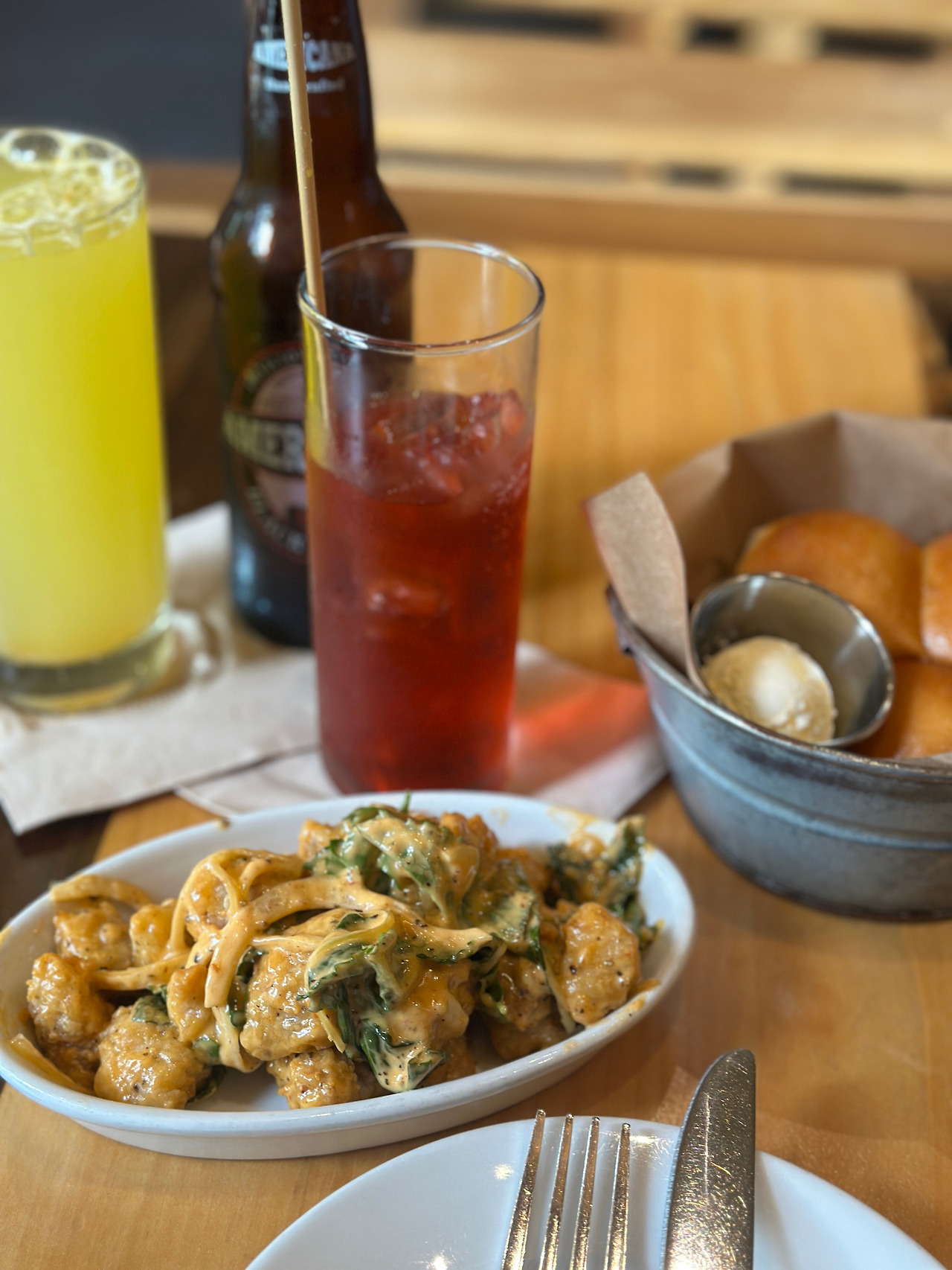 메뉴판을 보자마자 두 번째 줄에 있는 Fried alligator w/ chili garlic mayonnaise와 탄산음료를 주문했다. 윤기나는 빵과 함께 나온 악어튀김은 예상보다 훨씬 맛있었다.