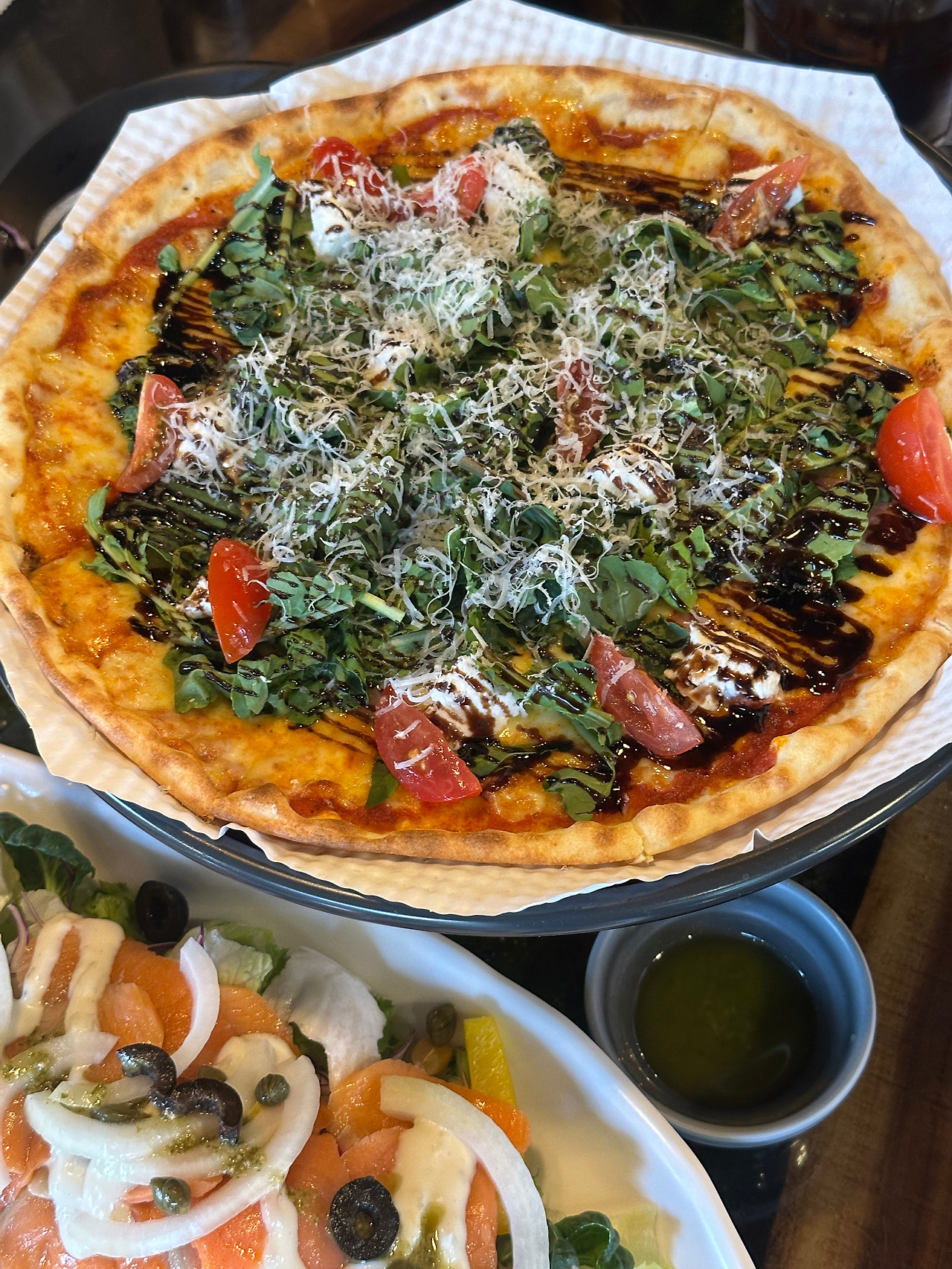 피자는 화덕에 얇게 구워 바삭하면서도 촉촉한 식감이었다. 신선한 루꼴라와 치즈가 가득했고, 같이 나온 바질소스와의 조합도 괜찮았지만 뭐니 뭐니 해도 꿀에 듬뿍 찍어 먹는 게 가장 맛있었다.