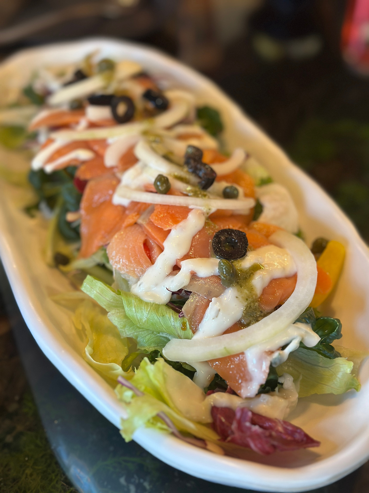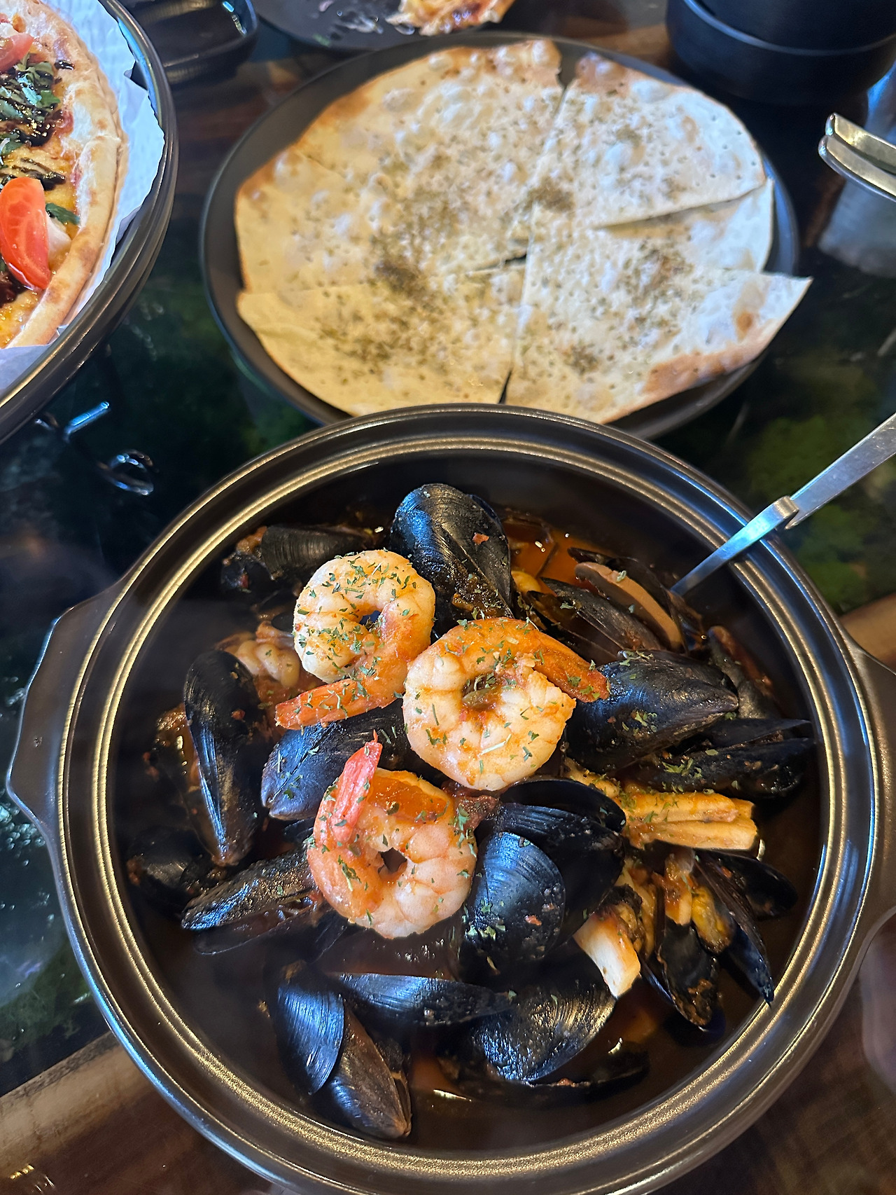 (먼저 나온 연어샐러드와 피자를 반씩 먹은 후 뒤늦게 나온 홍합스튜와 함께 새 음식처럼 찍어보았다.)